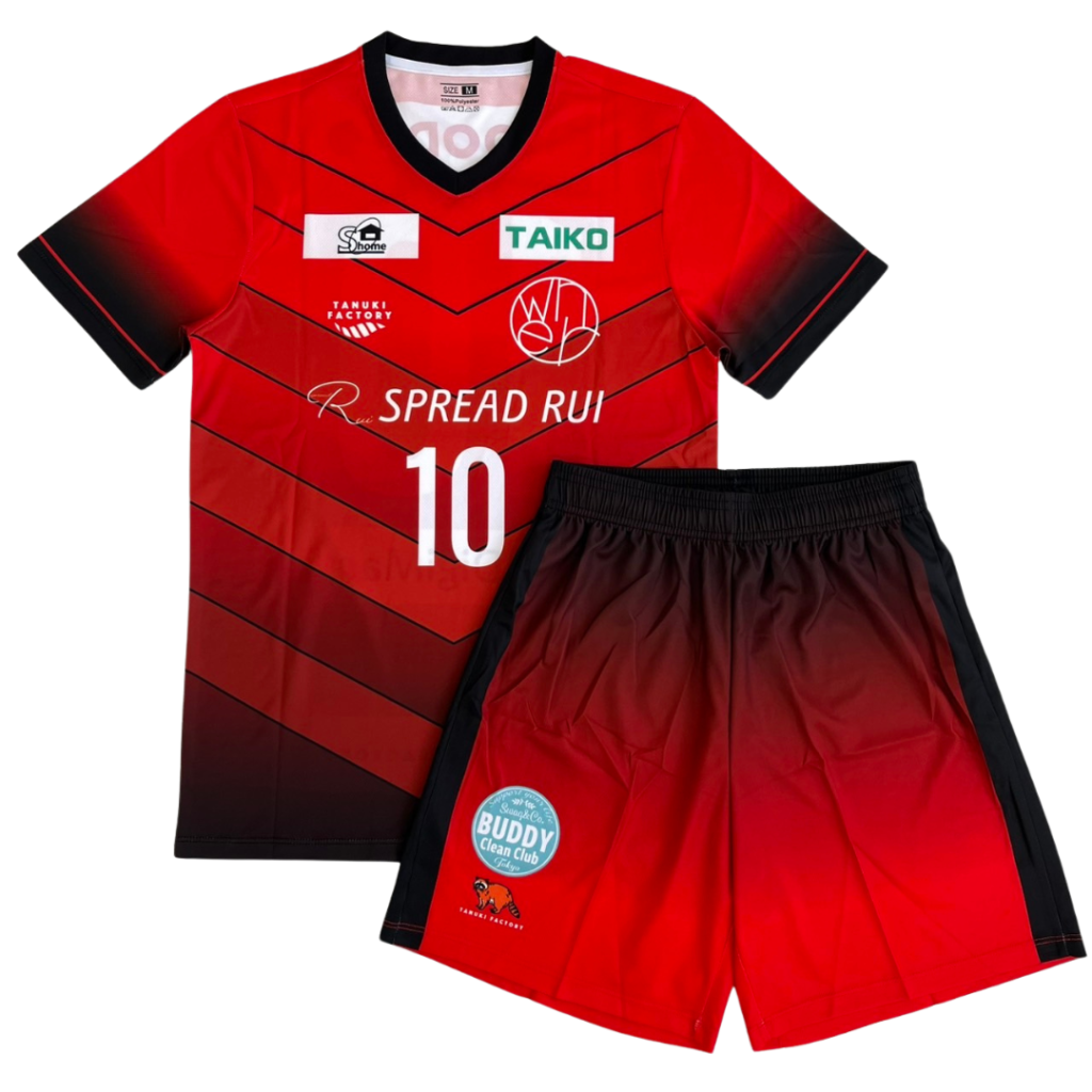 右胸に「TANUKI FACTORY」のロゴ、左胸にチームエンブレム、中央に番号を入れました。